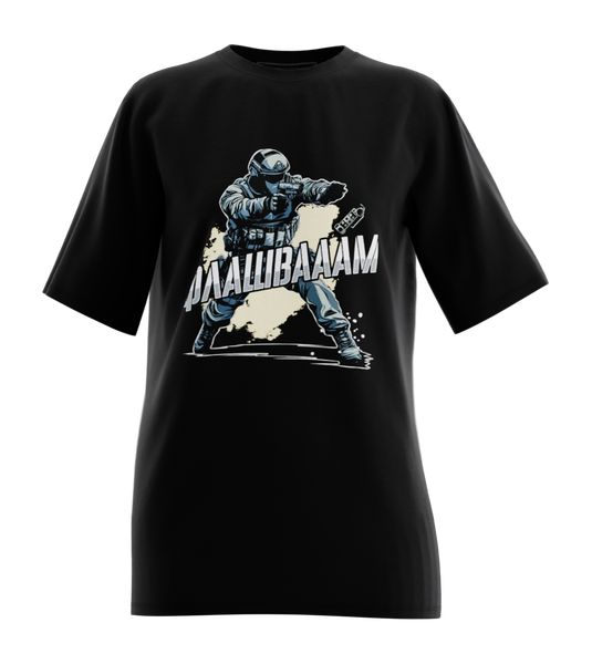 Надписът "ФЛАШВАААМ" преминава през цялата сцена като визуален ефект, напомнящ за ударната сила на флаш гранатата и първия влизащ в боя. Това не е просто тениска – това е знак, че играта започва, и ти си първи на вратата.