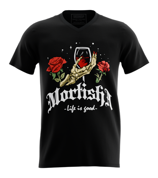 Дизайнът "Mortisha" е вдъхновен от философията за живот и красота, дори в най-мрачните моменти. Скелетната ръка, държаща чаша вино, символизира насладата от живота и приемането на всички негови аспекти. Червените рози добавят нотка на страст и вечност, а надписът "Life is Good" напомня за важността на позитивното отношение.