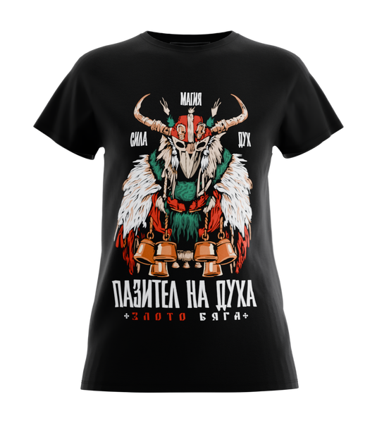 Дамската тениска "Пазител на духа" е вдъхновена от българските кукерски традиции, които датират от векове и носят послание за сила и защита срещу злите духове. Дизайнът съчетава мистичния образ на кукер, богато украсен с детайли, символизиращи мощ, смелост и културно наследство.