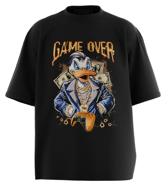 Централната щампа изобразява swag пате в геймърска премяна, облечено като гангстер с контролер в ръка – саркастична смесица между поп култура, гейминг и стрийтуеър. Комбинацията от ярки контури, златни акценти и провокативен текст "Game Over" превръщат тениската в улична класика.